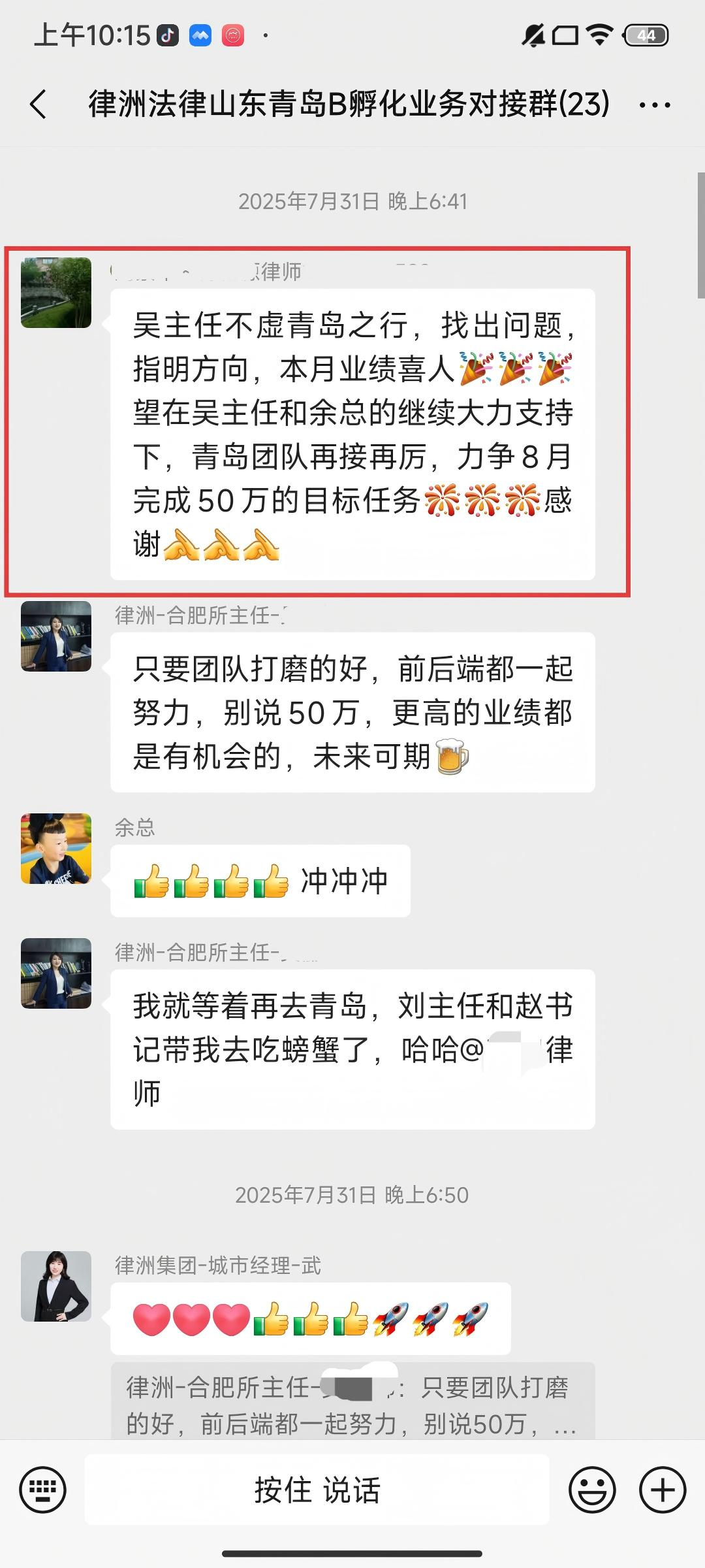 入职律洲后,首月个人业绩即达10W+。成功孵化2家合作律所,为合作律所在区域内具备核心竞争力,获得律所主任、合伙人一致好评。熟练掌握各类案件的电邀及面谈技巧,团队整体邀约率突破20%,签单率8%以上,投产比达到600%以上。擅长搭建团队,管理能力卓越,能够快速培养新人,赋能团队。